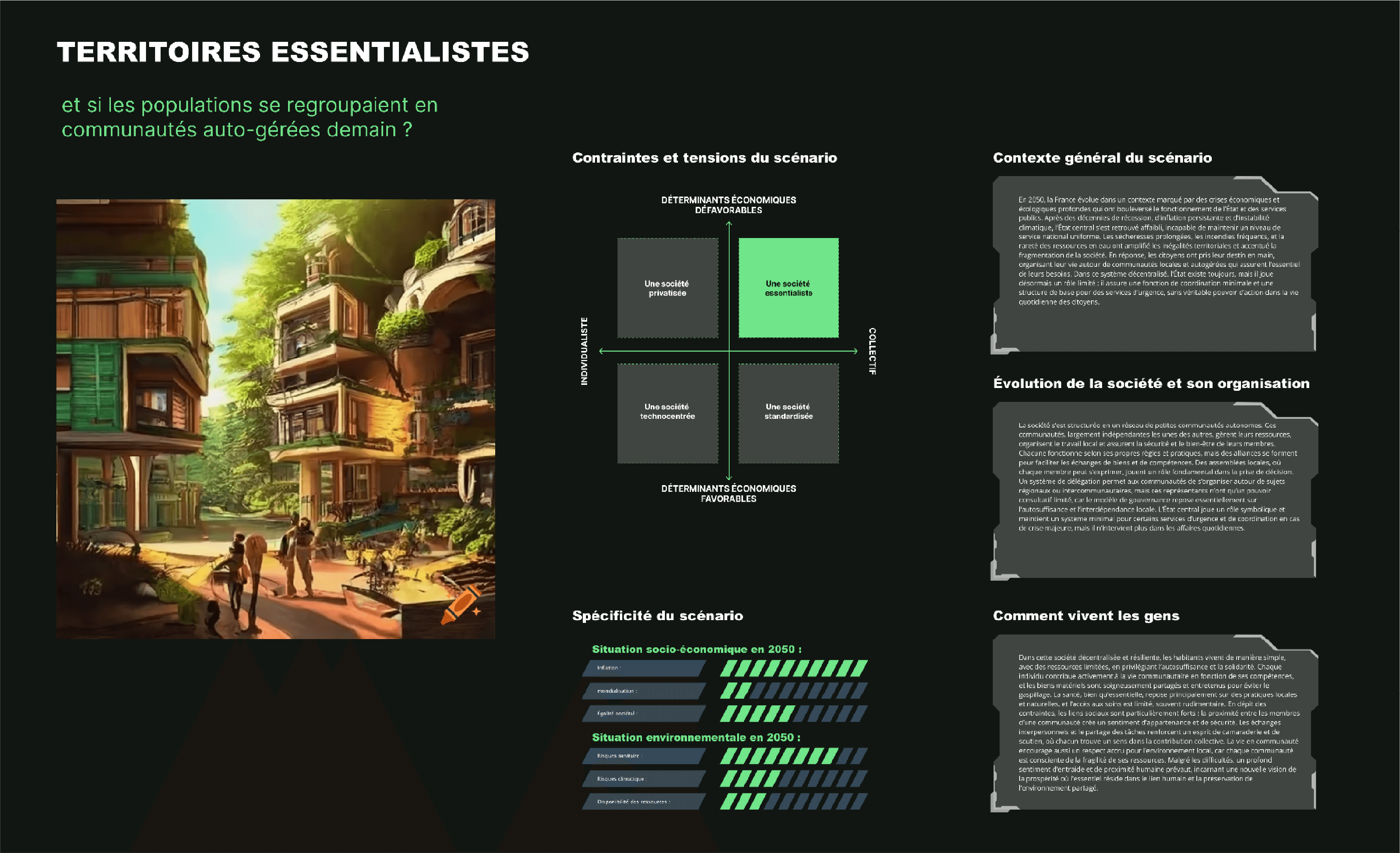 Élaboration de quatre scénarios d'avenir contrastés à horizon 2050, en croisant des axes de tension majeurs (individualisme vs collectif, contexte économique favorable ou défavorable).